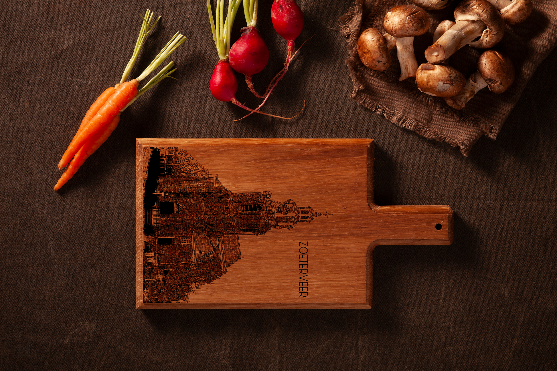 Voeg een vleugje Nederlandse elegantie toe aan uw keuken met onze Handgemaakte Zoetermeer Gegraveerde Kaasplank!