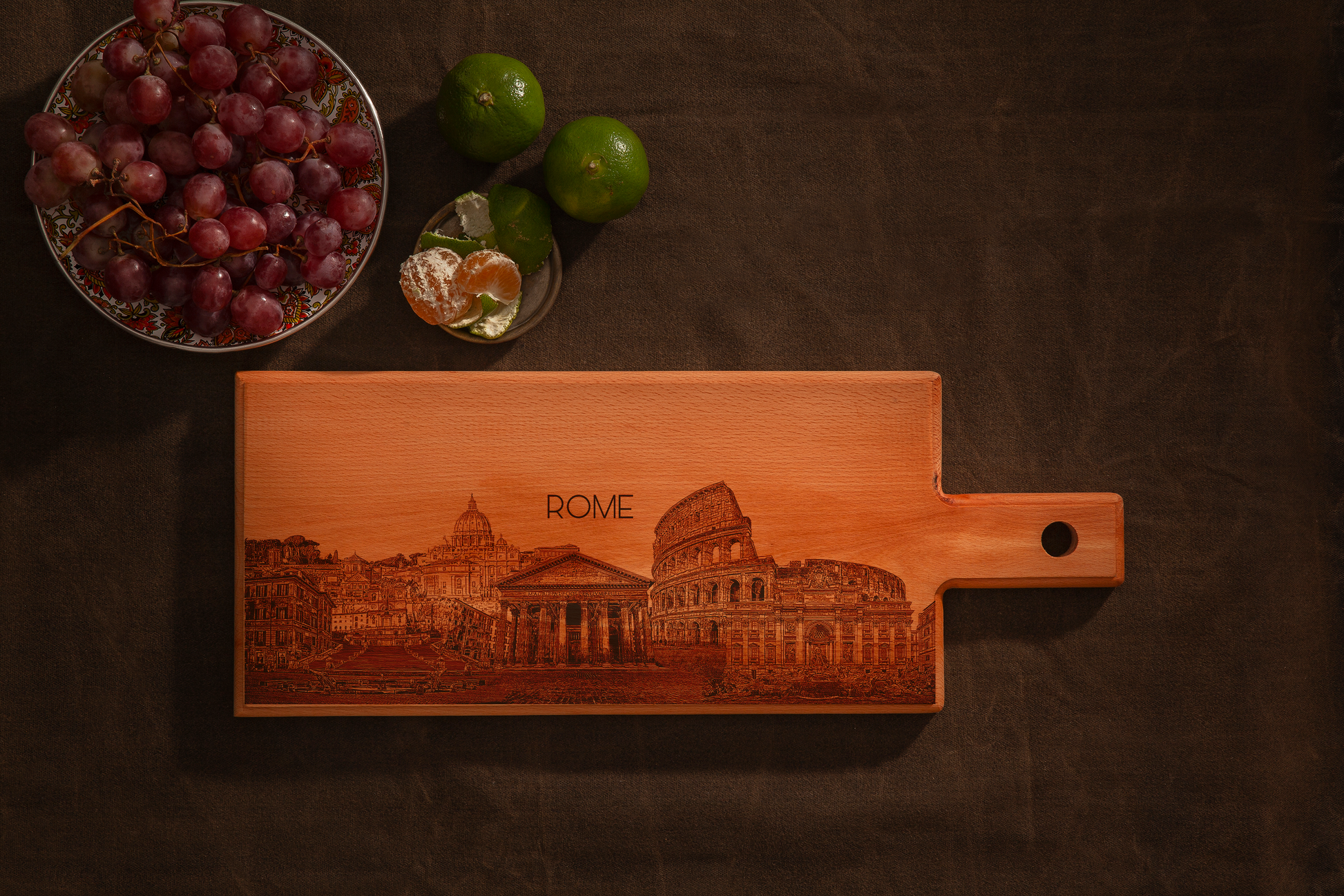 Elke plank wordt afzonderlijk vervaardigd en gegraveerd, waardoor ieder exemplaar uniek is. De verfijnde skyline brengt de meest iconische monumenten van Rome samen en maakt deze plank tot een bijzonder aandenken of stijlvolle decoratie geïnspireerd op de Eeuwige Stad.