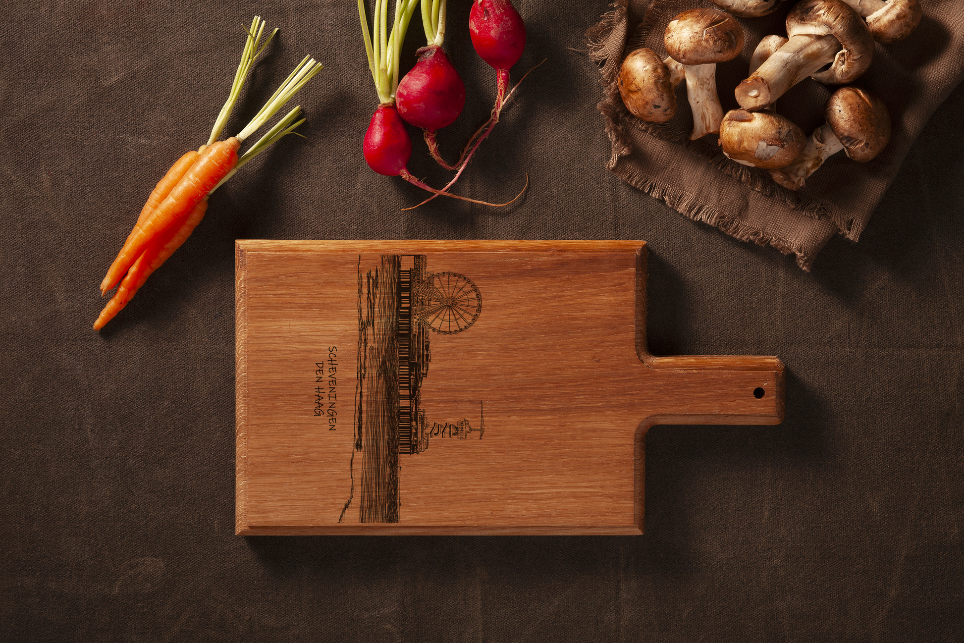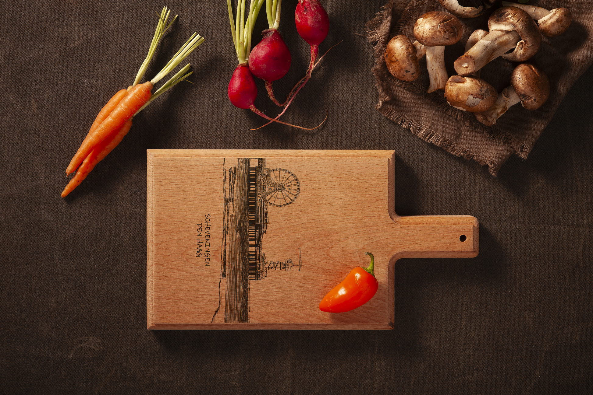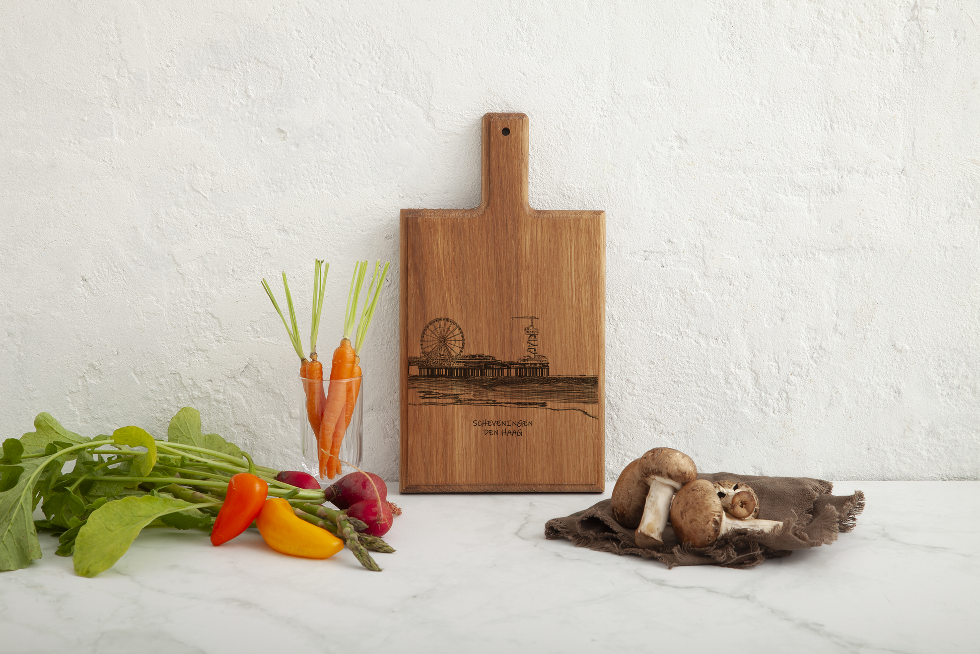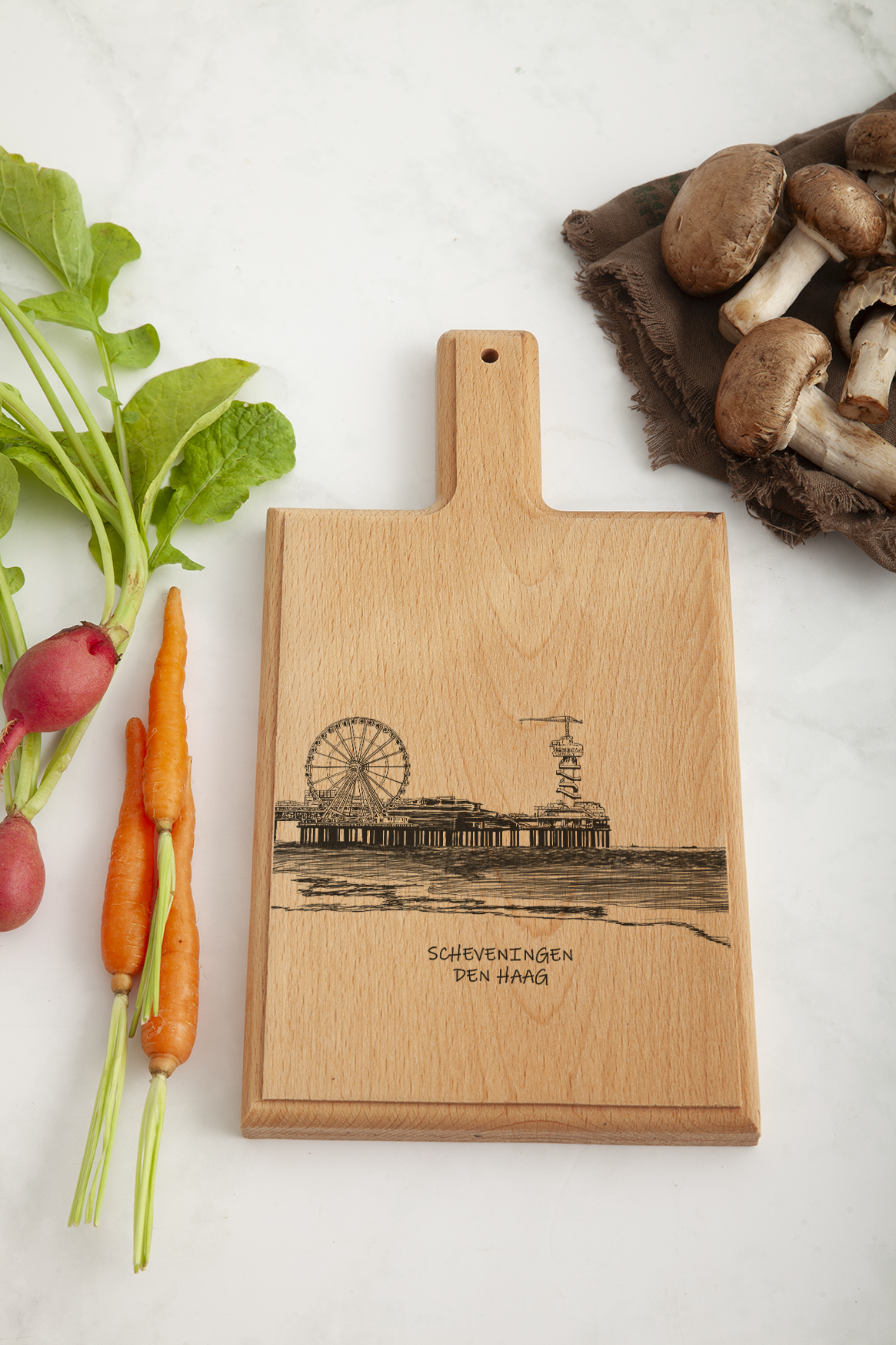 Breng de levendige kustsfeer van Scheveningen in huis met deze handgemaakte houten serveerplank, voorzien van een verfijnde gravure van de iconische De Pier.