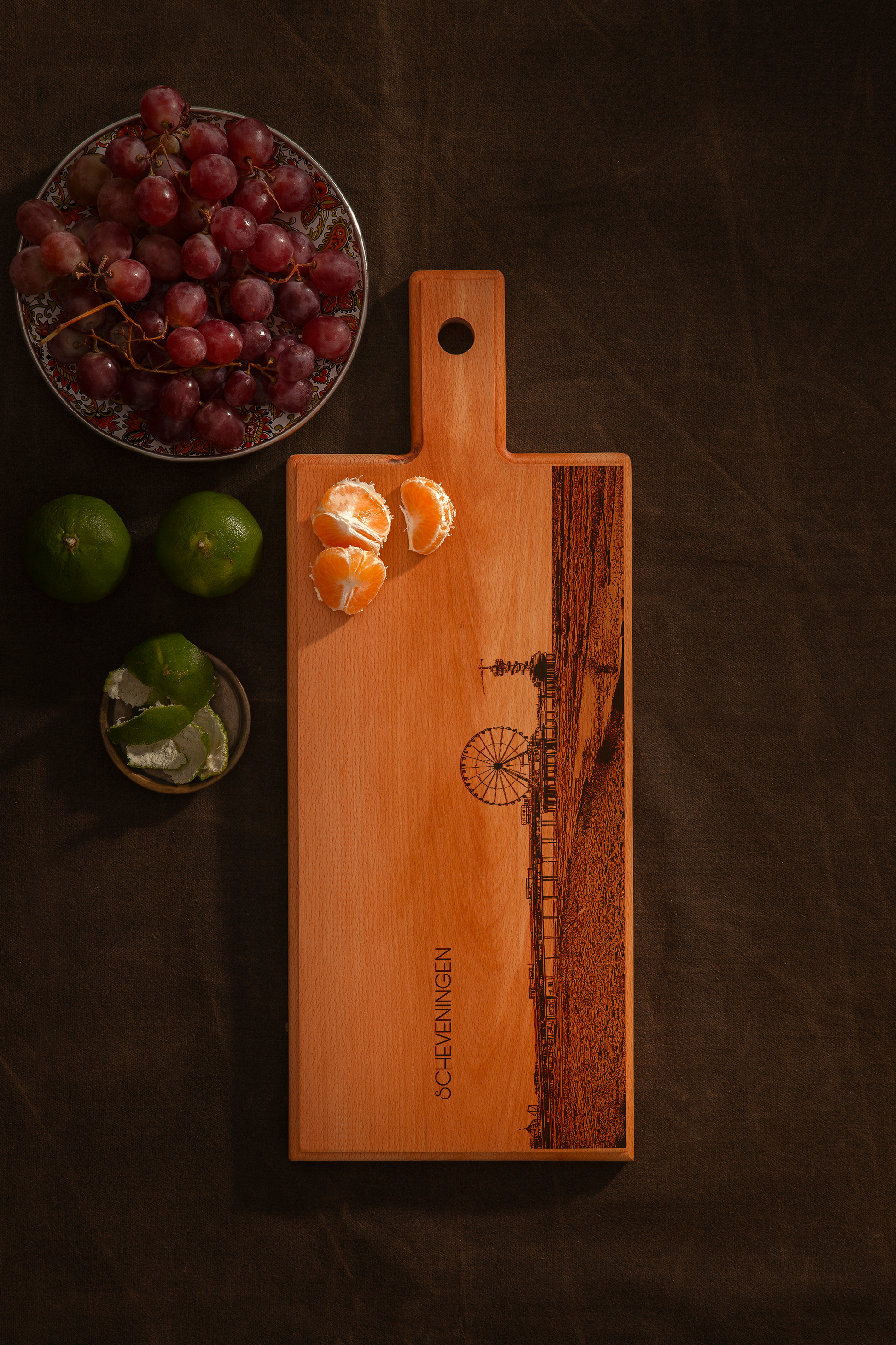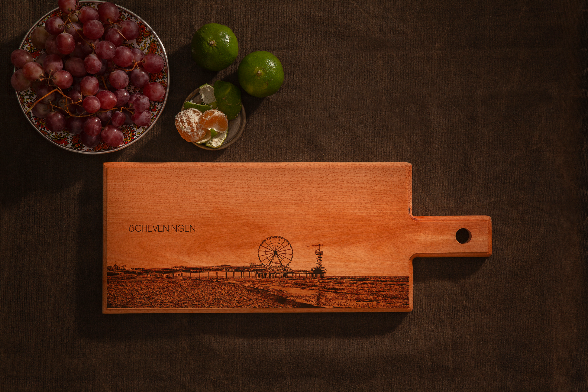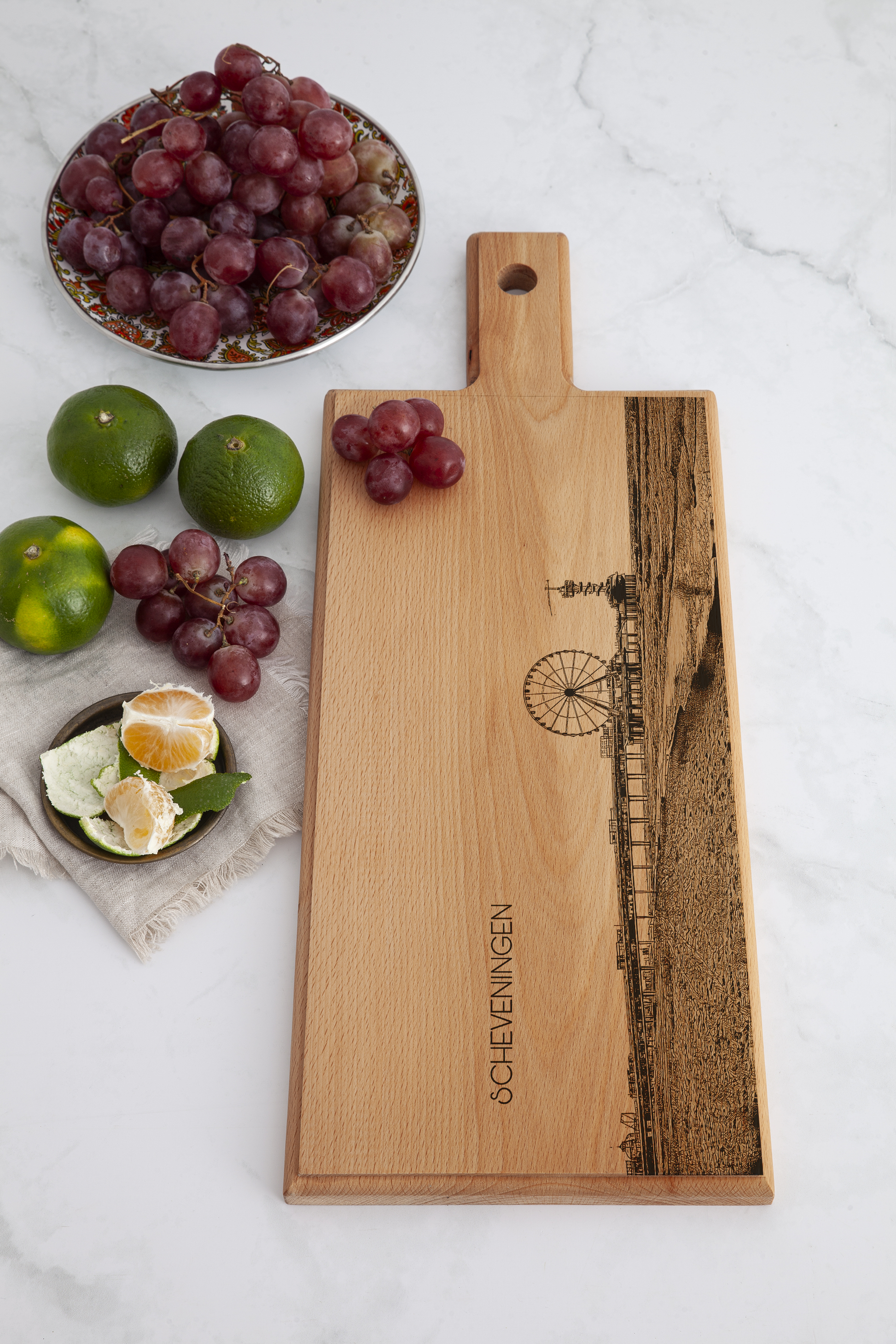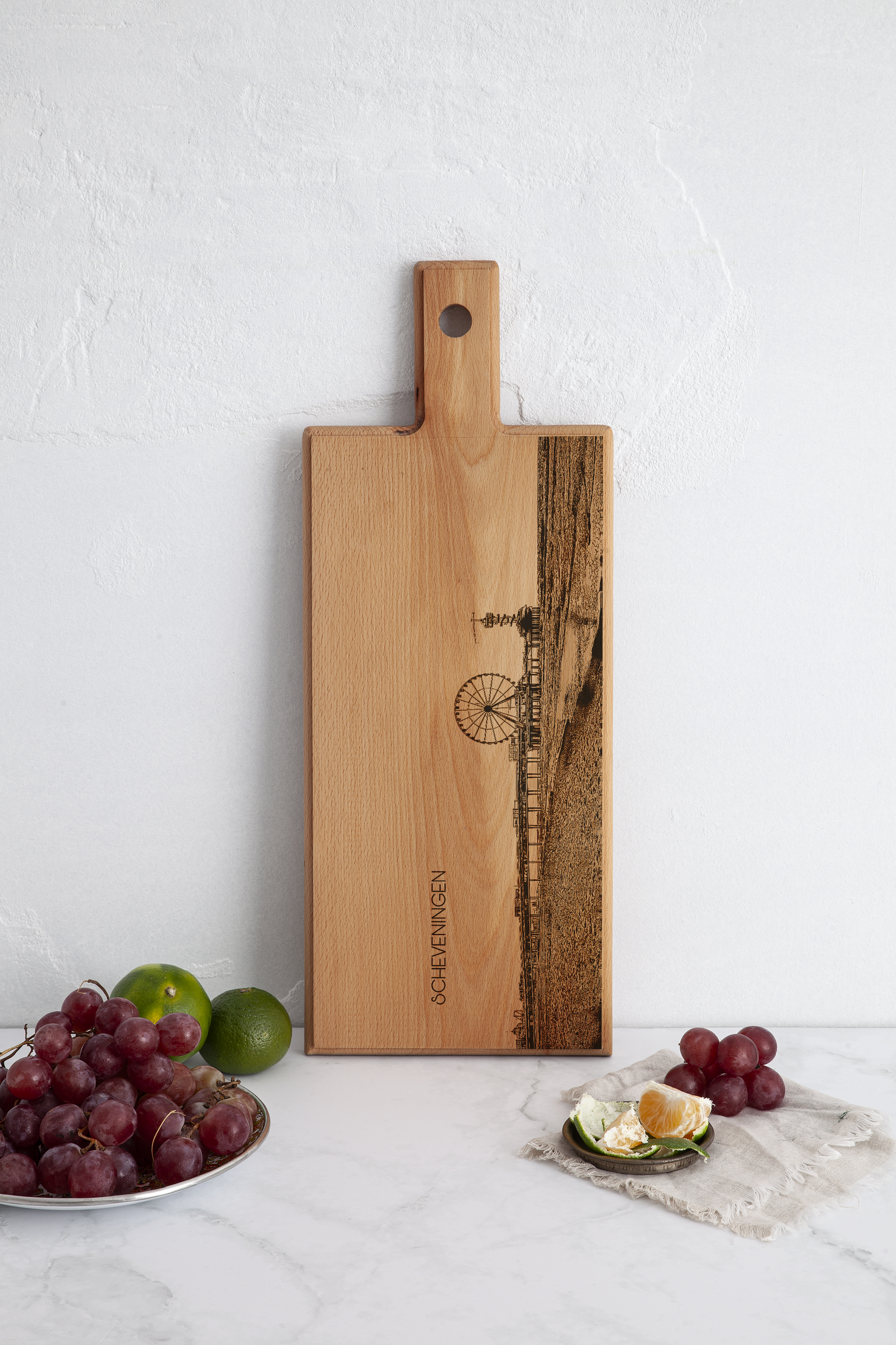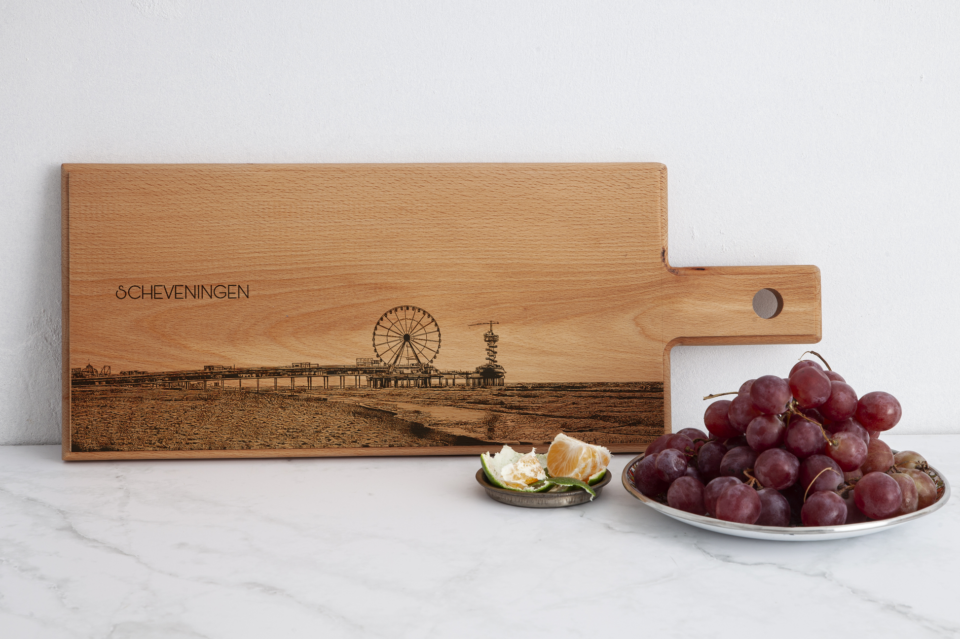Breng de levendige kustsfeer van Scheveningen in huis met deze Scheveningen De Pier houten serveerplank. Deze handgemaakte houten serveerplank, vervaardigd in Nederland, is voorzien van een verfijnde gravure van de iconische De Pier Scheveningen, hét herkenningspunt van de Haagse kust. Elke plank wordt gemaakt van massief Europees beukenhout en met de hand geschuurd en afgewerkt, waardoor elk exemplaar uniek is.