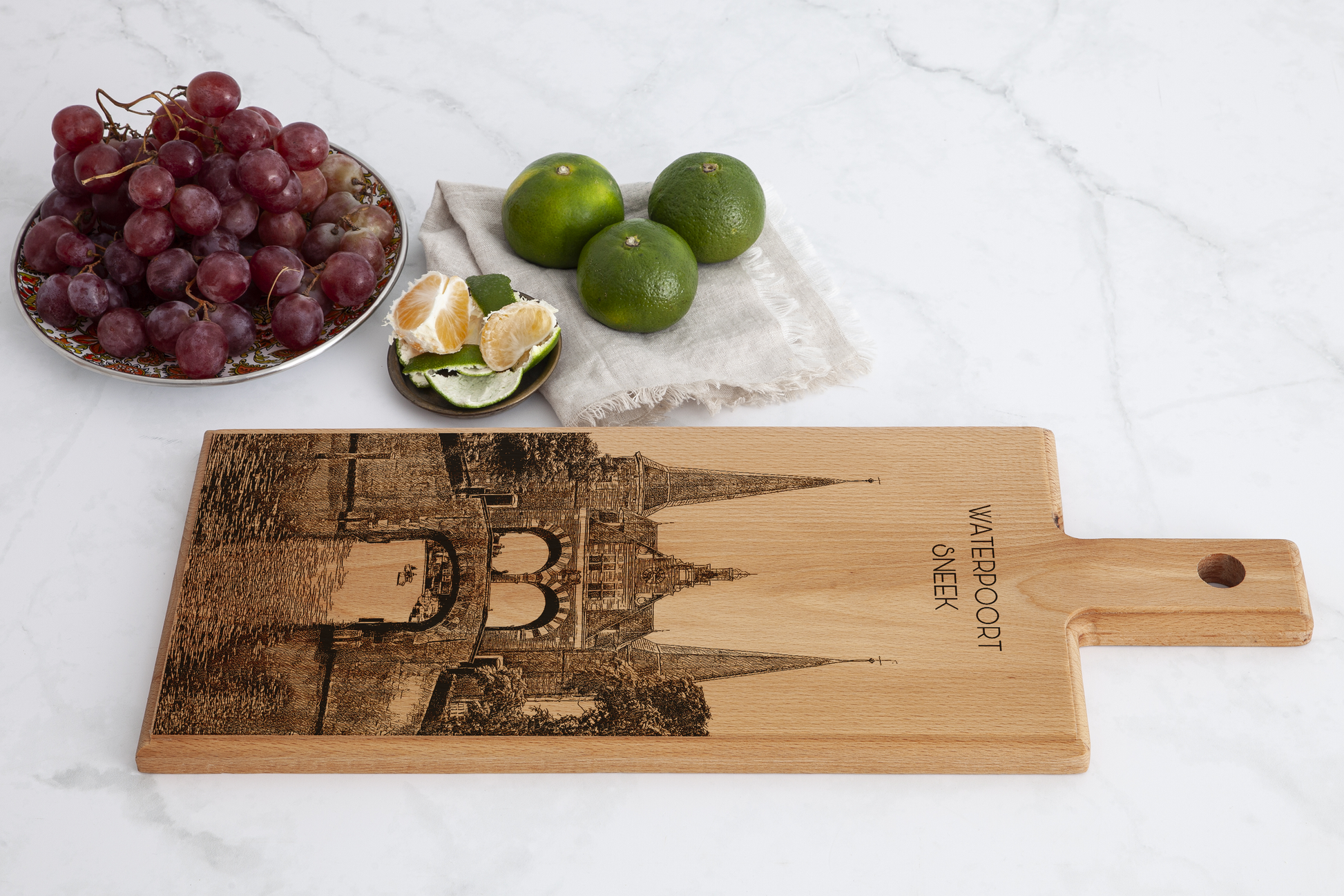 Elke plank wordt afzonderlijk vervaardigd en gegraveerd, waardoor ieder exemplaar uniek is. De herkenbare torens en boog van de Waterpoort staan symbool voor de maritieme geschiedenis van Sneek en maken deze plank tot een bijzonder aandenken of stijlvolle decoratie.