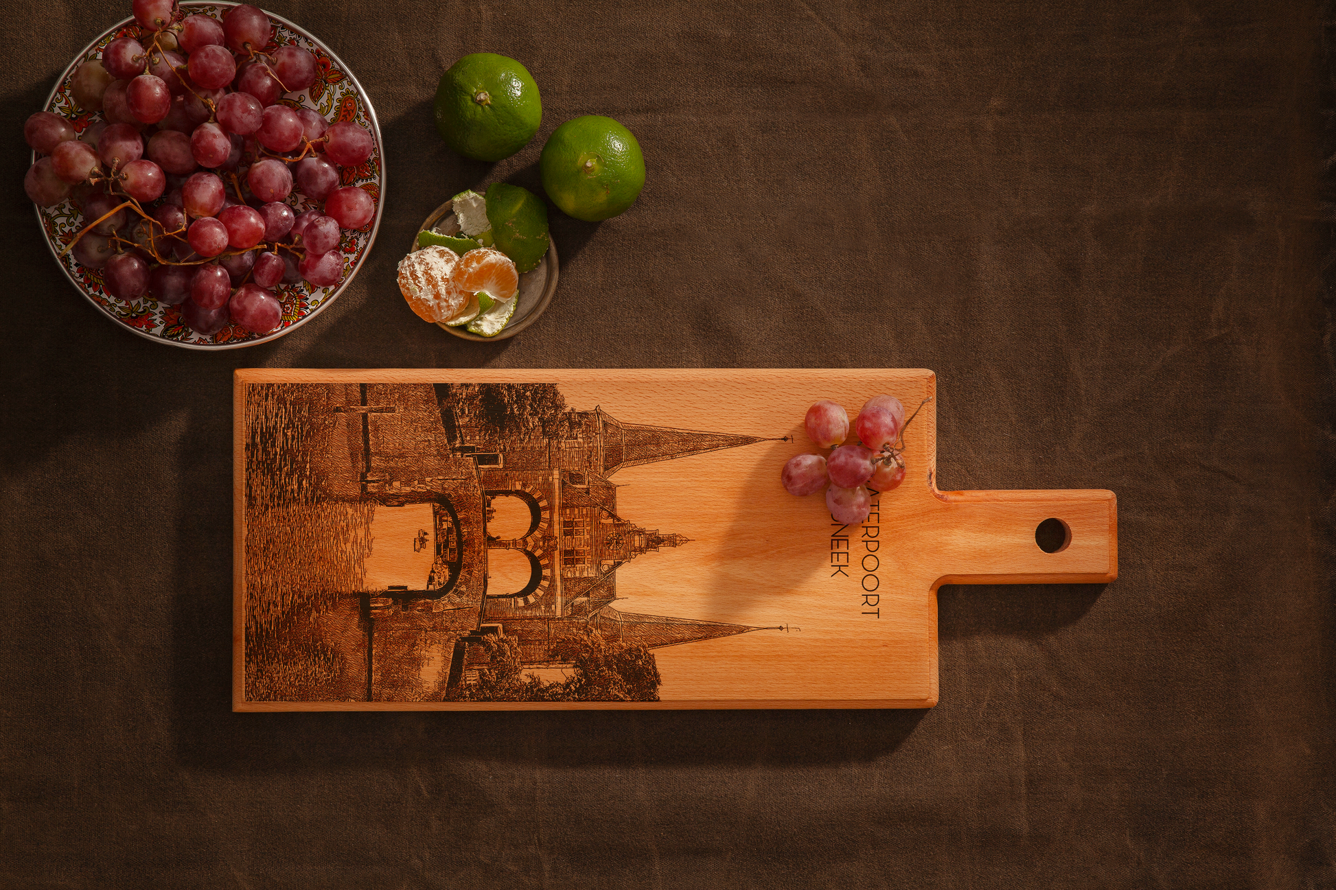 Deze handgemaakte houten serveerplank toont een originele illustratie van Waterpoort, met de hand getekend en gegraveerd in Nederland. Gemaakt van massief beukenhout en afgewerkt met oog voor detail, straalt deze plank Nederlands vakmanschap en Fries erfgoed uit.