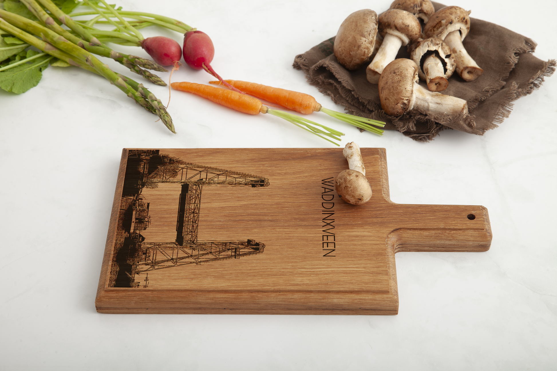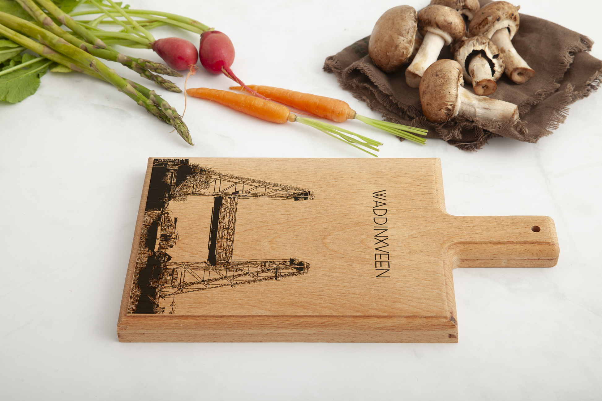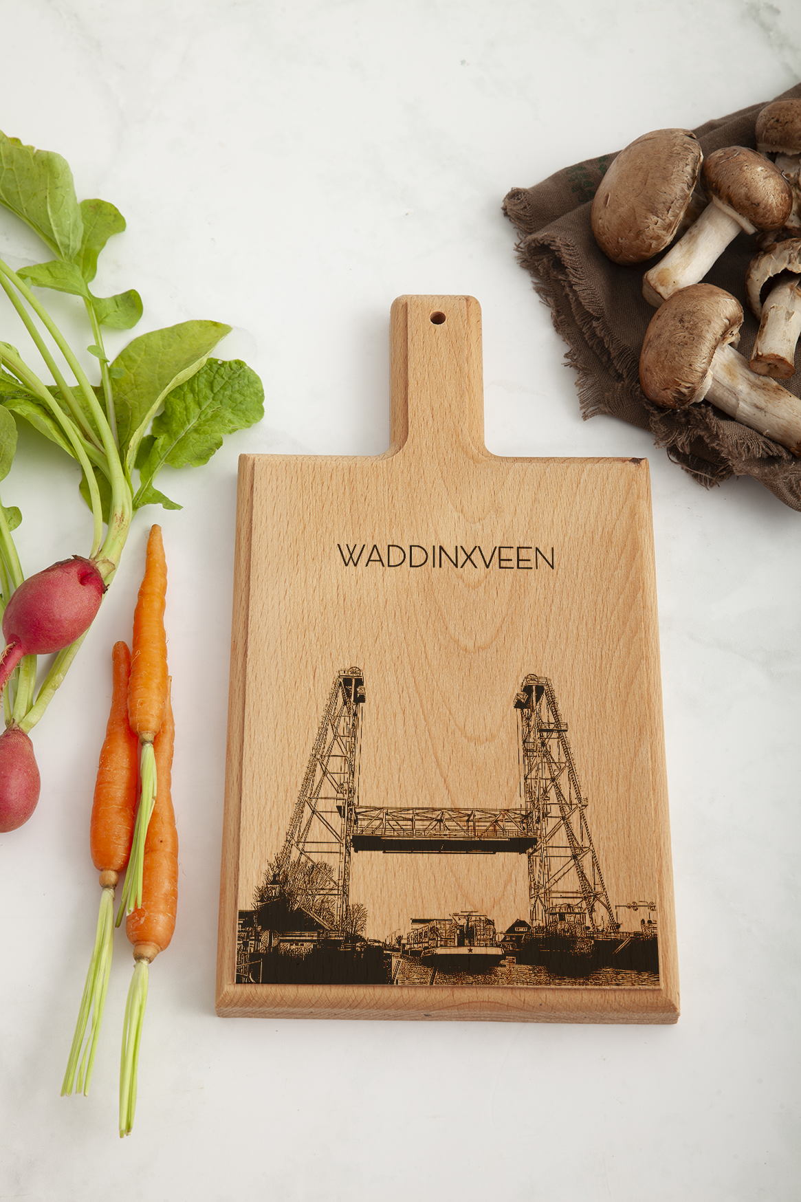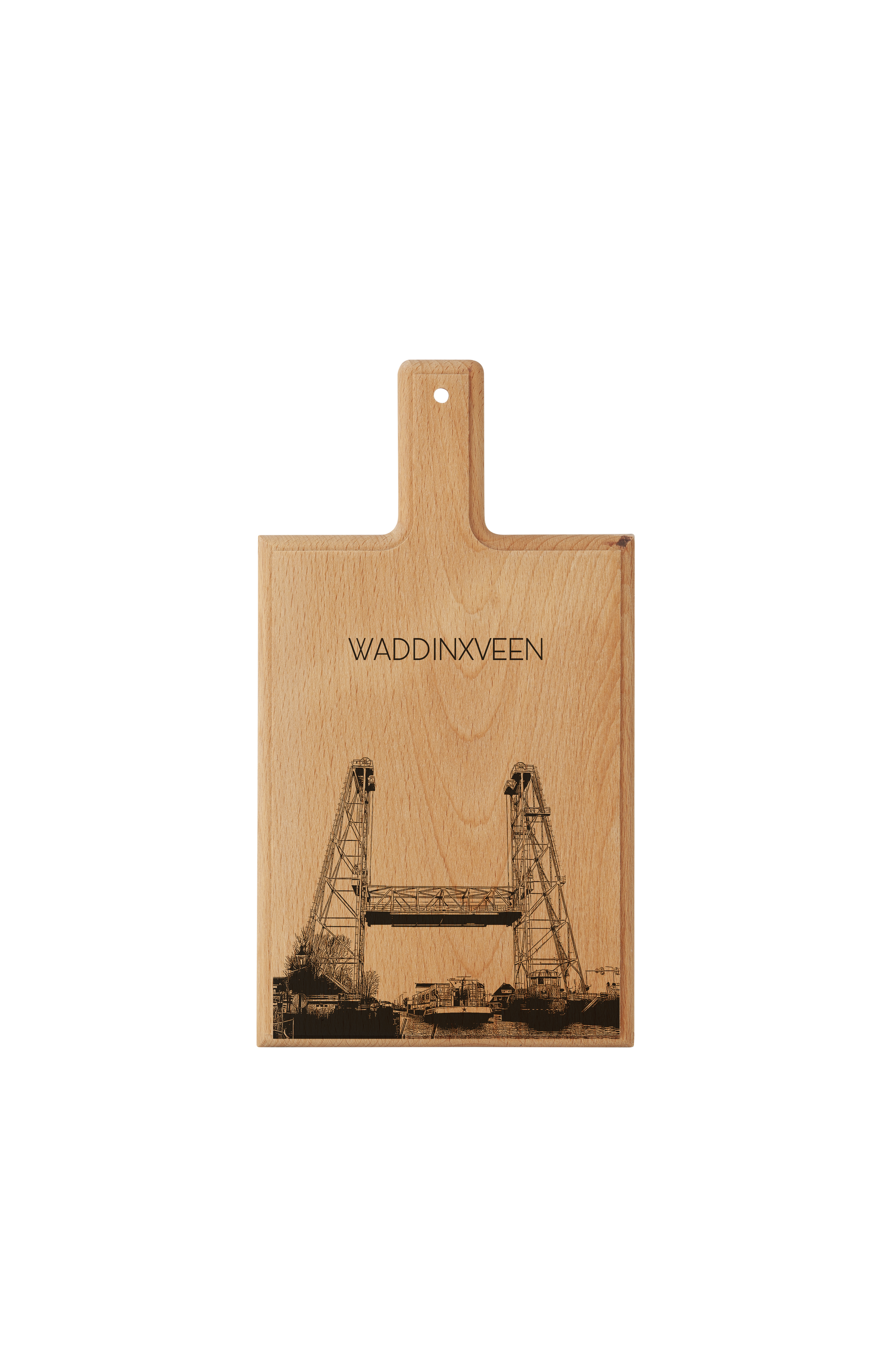 Deze plank is vervaardigd uit één massief stuk Europees beukenhout en afgewerkt met een gedetailleerde, handgetekende illustratie die zorgvuldig in het hout is gegraveerd. Waddinxveen, bekend om zijn waterwegen, groen en dorpse karakter, komt prachtig tot uiting in dit tijdloze en harmonieuze ontwerp.