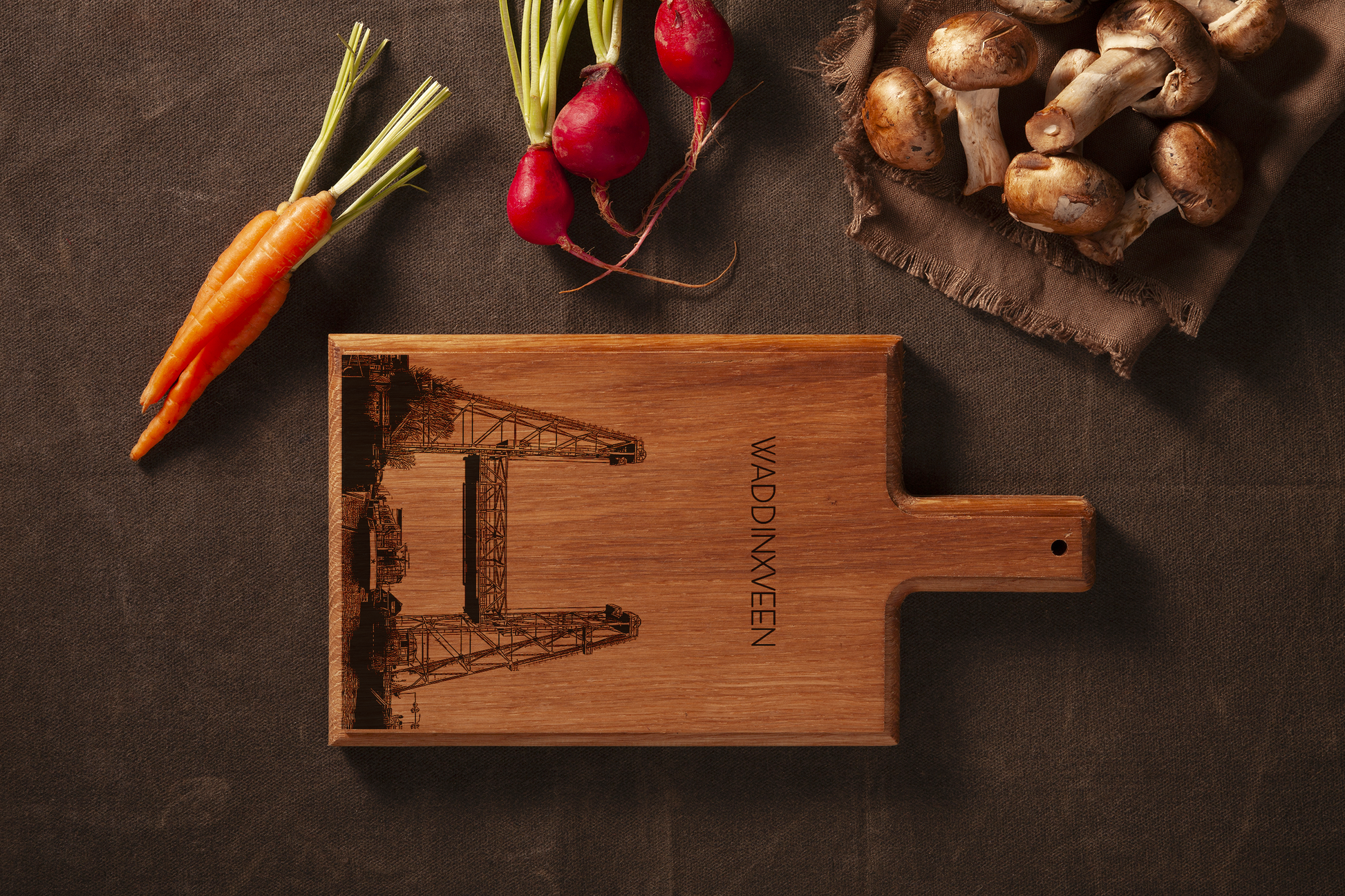 Breng de rustige sfeer van het Groene Hart in huis met deze handgemaakte houten serveerplank, voorzien van een verfijnde gravure geïnspireerd op Waddinxveen.