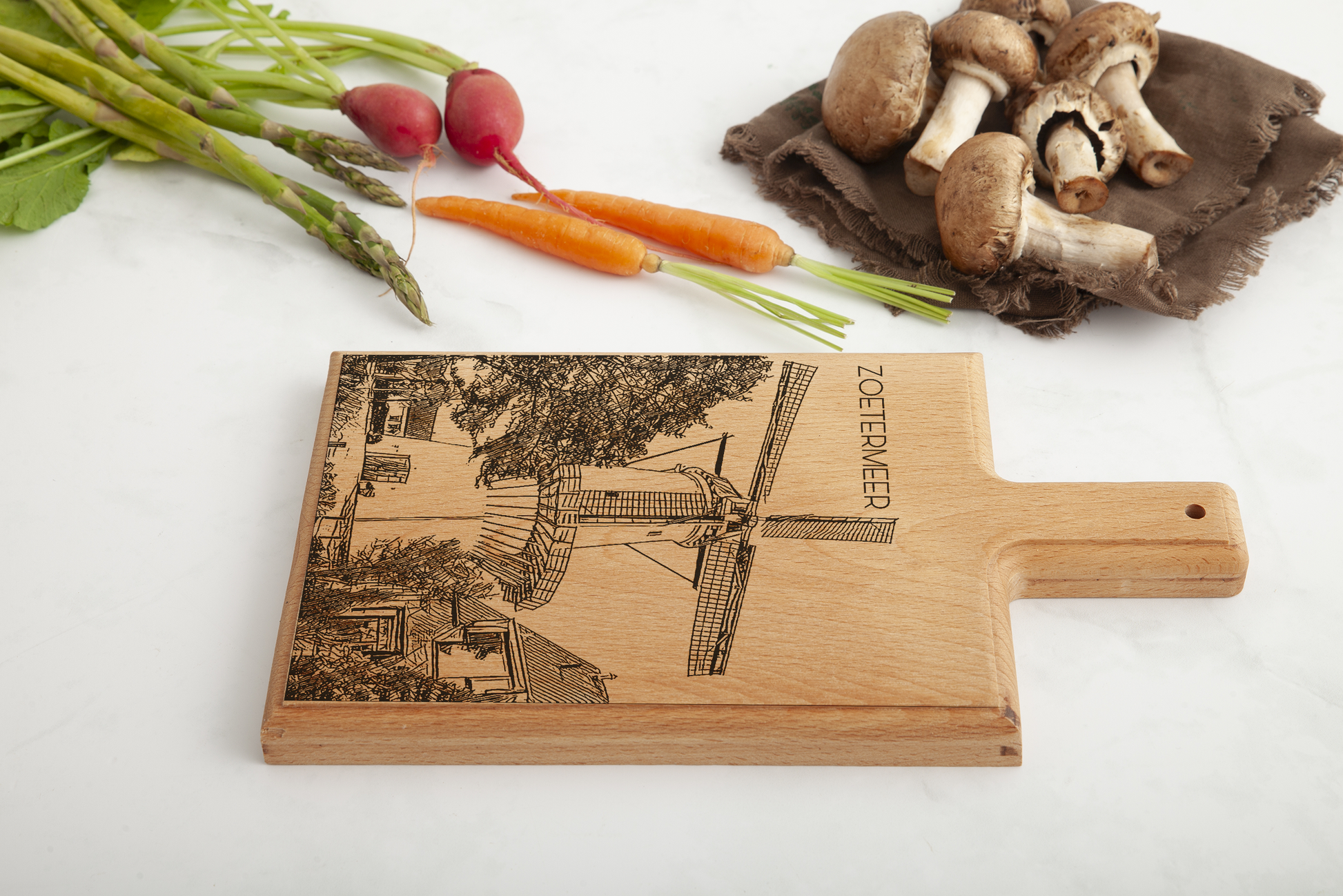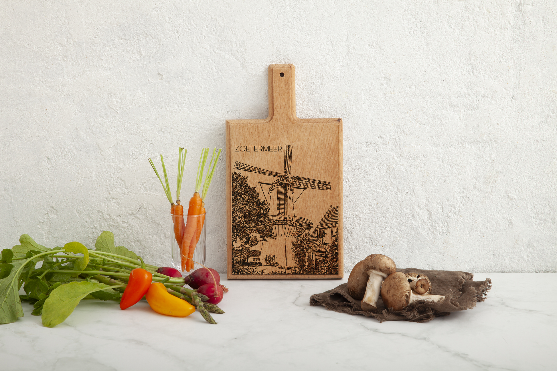 Crafted from one solid piece of European beechwood, this board showcases an original hand-drawn illustration that is precisely laser-engraved into the wood. The classic windmill silhouette of Molen de Hoop—one of Zoetermeer’s most recognizable landmarks—combined with the warm natural grain of beechwood creates a timeless and authentic design.