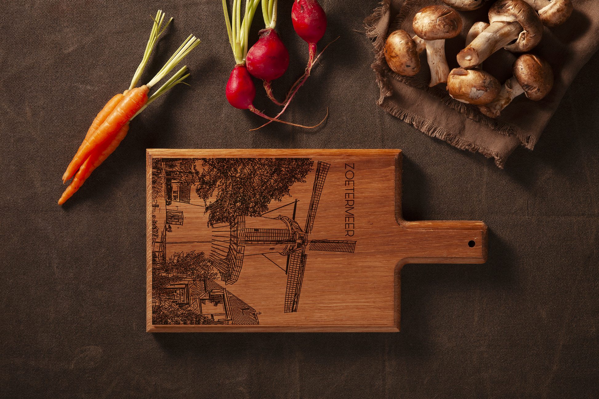 Bring a symbol of traditional Dutch craftsmanship into your kitchen with this handmade wooden serving board, featuring a finely engraved illustration of the historic Molen de Hoop.